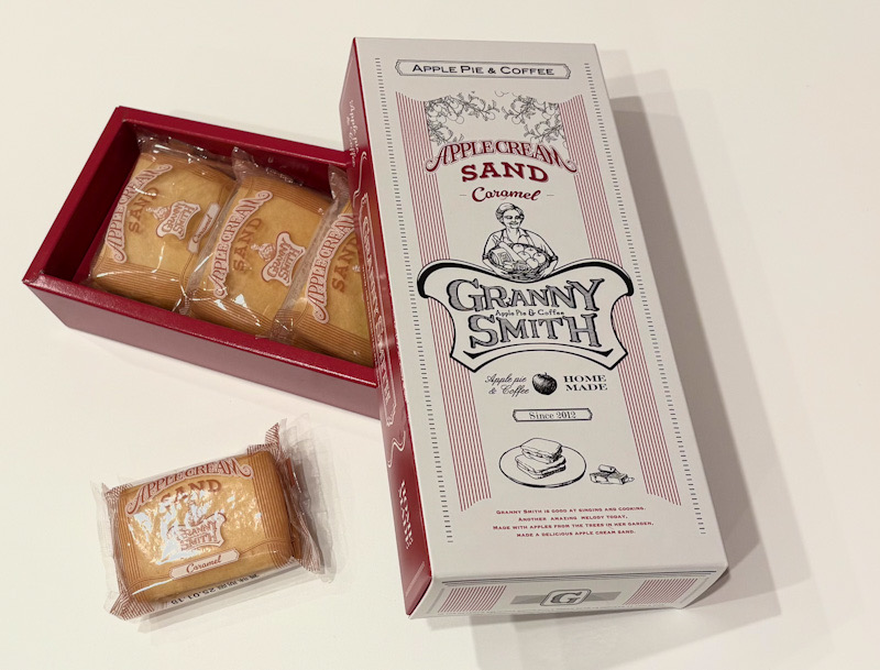 サクサクなクッキーにサンドされたクリームは軽めで、キャラメルのほろ苦い香りが鼻から抜ける。そしてりんごの果肉もちらほら。甘すぎず、なかなかボリュームがある割にはさっぱりとしていて美味しいです。かわいい箱に入った4個入り。グラニースミス全店舗で販売されています。