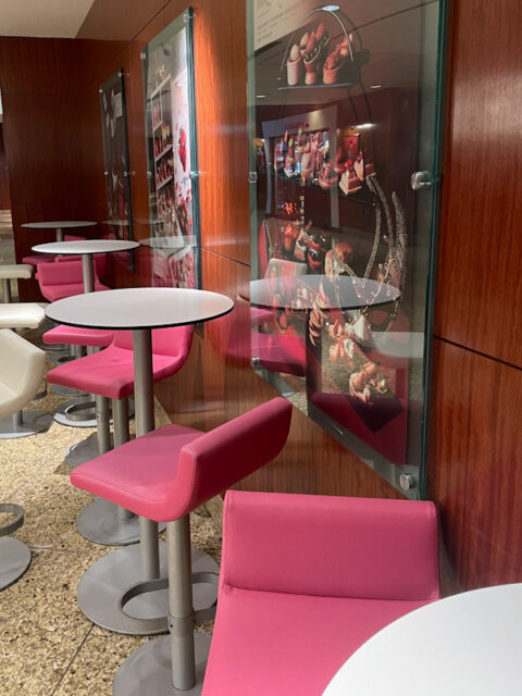イートインスペースはこんな感じで、鮮やかなショッキングピンクと白、ライトグレーの配色がおしゃれな雰囲気。お店の前と横に、全部で6席ほどあったと思います。